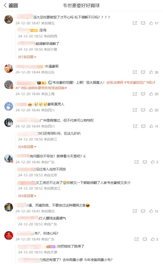 在韋世豪的微博評論區(qū)下充斥著兩種聲音,一種認(rèn)為韋世豪當(dāng)初也是廣州隊隊長,有什么事可以商量,另一種則認(rèn)為俱樂部欠債還錢天經(jīng)地義。你怎么看?